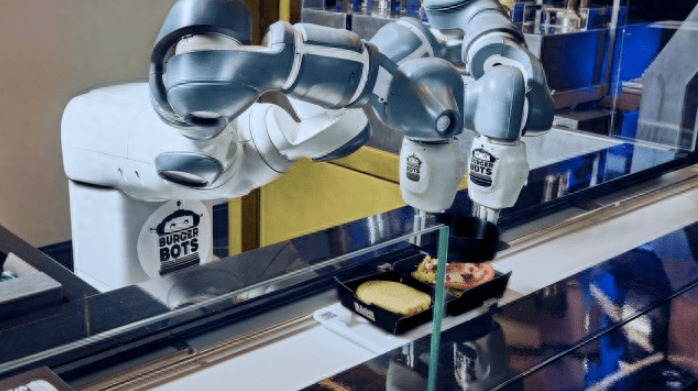 正在洛斯加托斯的Breaking Dawn/First Born餐厅里,没有厨师忙碌的身影,取而代之的是机械臂精准舞动——ABB Robotics取餐饮从动化草创公司BurgerBots联手打制的机械人工做坐,仅需27秒便能完成一份汉堡的全程制做,速度堪比工业流水线。